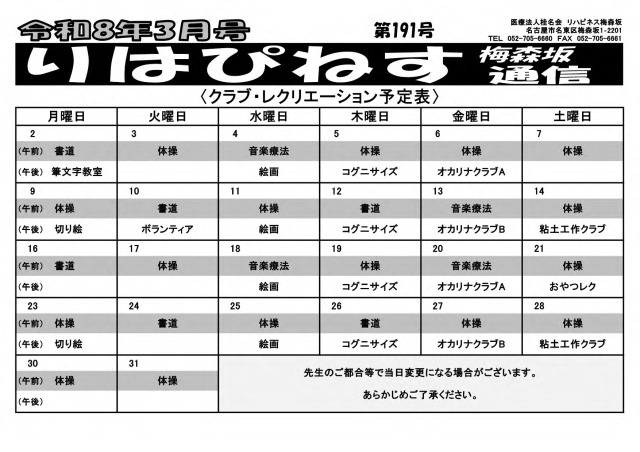 新着お知らせ 2025.11.272025.12.29 新着お知らせ 令和7年4月より、利用時間が9:00~16:10に変更となりました。 【毎月更新】りはぴねす梅森坂通信/献立表 画像をクリックすると印刷用のPDF版が開きます。 令和8年1月号【第189号】 令和7年12月号【第188号】 バックナンバーはこちら 献立表 偏りない栄養バランスはもちろんのこと、季節の食材を取り入れた多彩なメニューをご提供しています。(画像をクリックするとPDF版が開きます) 空き状況 以下は、12月23日時点の空き状況です。最新情報については、お問い合わせ時にご確認ください。 月火水木金土空き状況〇〇◎◎◎◎◎空きあり、〇若干空きあり、△要相談、×空きなし 一日体験利用のご案内ご利用希望者さまの一日体験利用や見学は随時受け付けております。お気軽にお問い合わせください。
